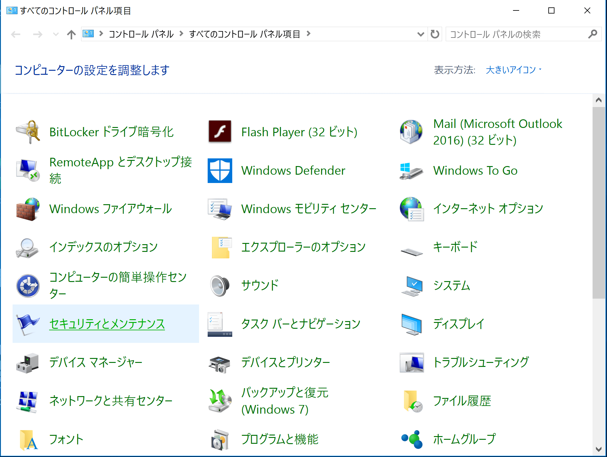 コントロールパネルの中身が上図と異なる見え方の場合、右上の「表示方法:カテゴリ」になっている部分をクリックして「大きいアイコン」に切り替えてください。