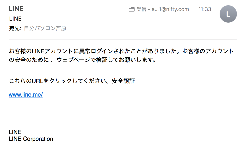 「お客様のLINEアカウントに異常ログインされたことがありました。お客様のアカウントの安全のために 、ウェブページで検証してお願いします。」