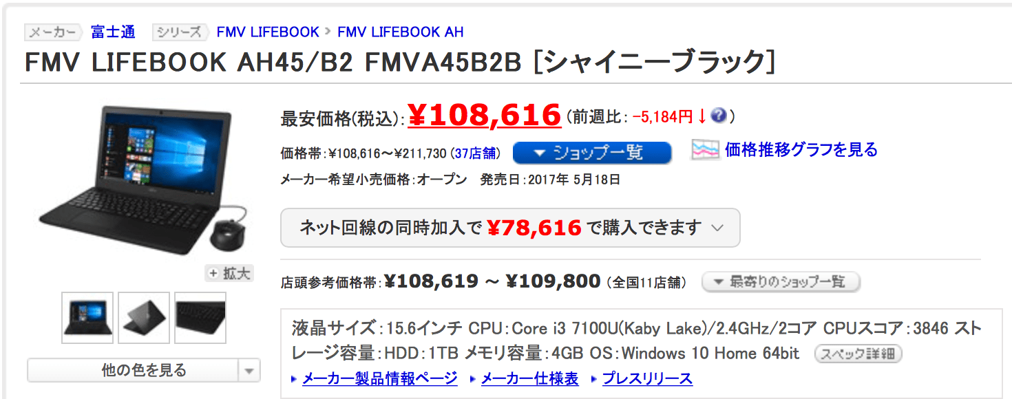 最安価格で税込108,616円でした。(2017年8月12日8時半現在)