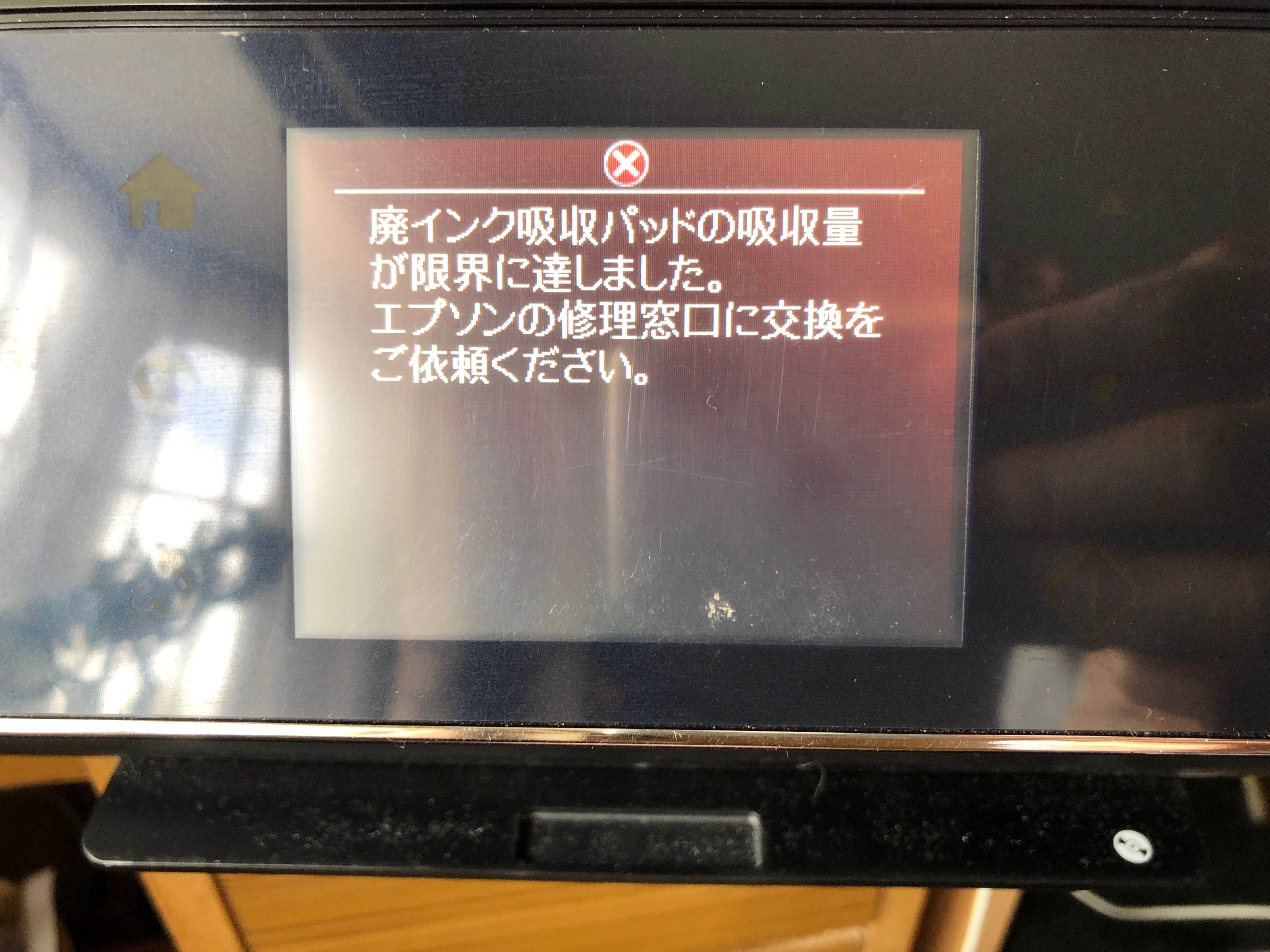 教室で使っているエプソンのプリンタ複合機EP-905Aで廃インク吸収パッドの吸収量限界エラーがでました。