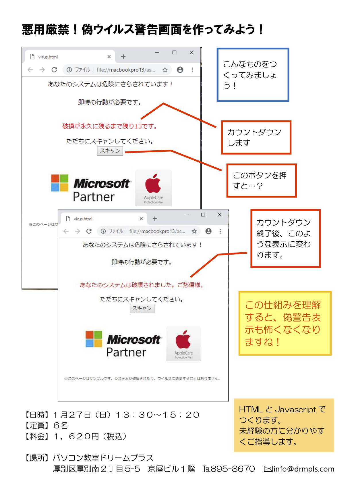 悪用厳禁!偽ウイルス警告画面を作ってみよう! Twitter Facebook はてブ Pocket LINE コピー 2019.05.07 2019.01.03 【内容】HTML(ホームページを記述するマークアップ言語)とJavascript(ホームページに動きを持たせることのできるプログラミング言語)のちょっとした知識を使って「偽ウイルス警告画面」を作ります。 この手の画面、こんなに手軽に作れてしまうのです。 インターネットのサイトを見ているときに急に変な警告がでてきたとき、この知識があると「ああ、これはただそういうページが表示されているだけなんだな。」と、どうってことのない取るに足らないもので恐れることはないと思えるようになる・・・かもしれません。
